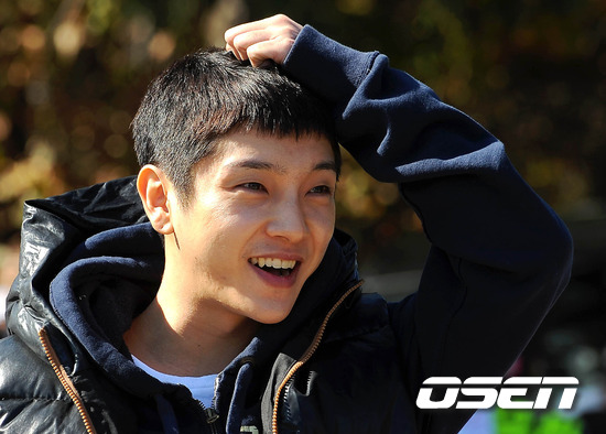 초신성 윤학이 짧게 자른 자신의 머리카락을 만지고 있다.