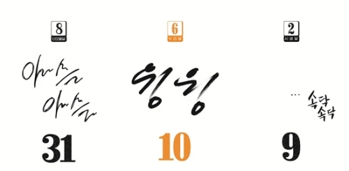 오윤아가 직접 쓴 8월 31일 '아슬아슬'은 글자의 모든 획이 비틀거리듯 옆으로 누워 아슬아슬한 마음을 표현했다. 종이 오른쪽 한 켠에 속삭이는 것처럼 작에 쓰여진 권해효 '속닥속닥'(2월9일), 굵은 활자로 속도감있게 휘날려 쓴 유열 '윙윙'(6월 10일)은 재미를 더했다.