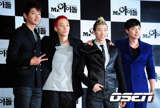 [OSEN= 백승철 인턴기자] 25일 오후 서울 건대입구 롯데시네마에서 열린 영화 'Mr.아이돌' 시사회에 참석한 지현우, 김랜디, 박재범, 장서원이 포토타임을 갖고 있다.