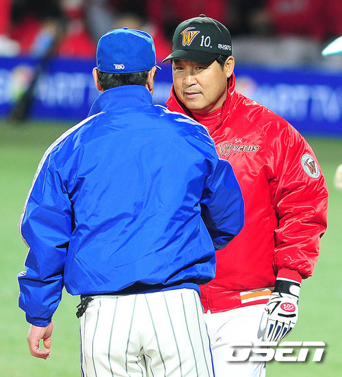 '2011 롯데카드 프로야구 한국시리즈'삼성 라이온즈와 SK 와이번스 경기 1차전 경기 전 류중일 감독과 이만수 감독이 인사를 나누고 있다