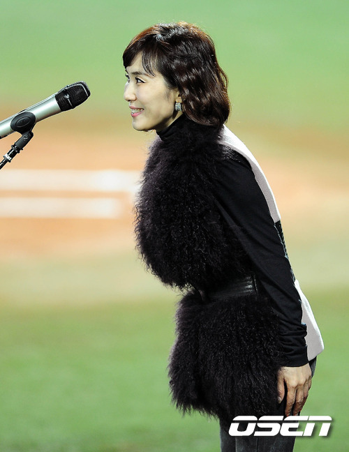 '2011 롯데카드 프로야구 한국시리즈'삼성 라이온즈와 SK 와이번스 경기 1차전 식전행사에 가수 장혜진이 애국가를 부르고 있다
