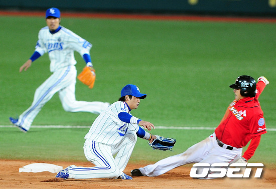 '2011 롯데카드 프로야구 한국시리즈'삼성 라이온즈와 SK 와이번스 경기 1차전 4회초 2사 1루 김강민이 2루 도루에 성공하고 있다