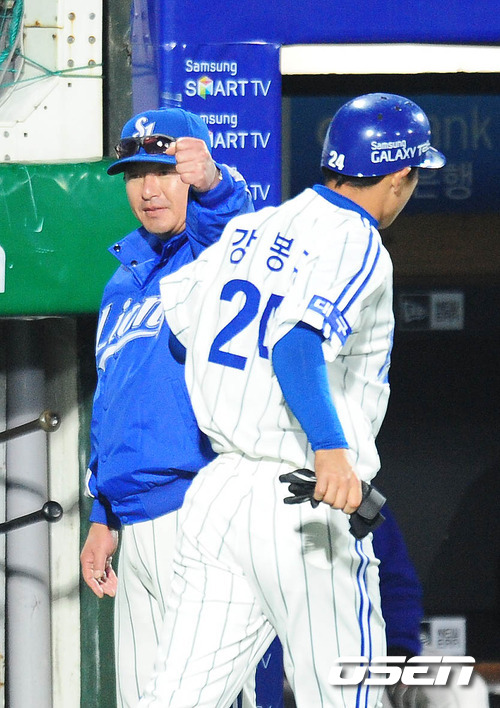 4회말 2사 1,2루 신명철 2타점 적시타때 1루 주자 강봉규 득점을 올리며 류중일 감독의 환영을 받고 있다.