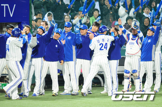 4회말 2사 1,2루 신명철 2타점 적시타때 강봉규,최형우가 득점을 올리며 덕아웃 동료들의 환영을 받고 있다.