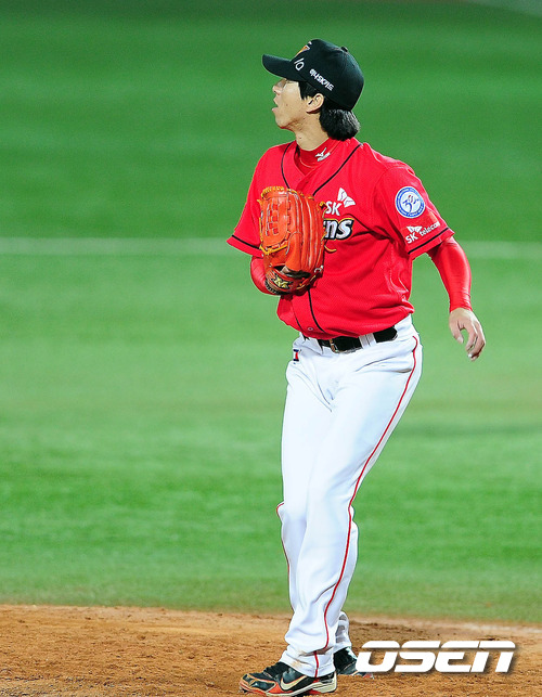 '2011 롯데카드 프로야구 한국시리즈'삼성 라이온즈와 SK 와이번스 경기 1차전 4회말 2사 1,2루 SK 고효준이 삼성 신명철에게 2타점 2루타를 맞고 타구를 바라보고 있다
