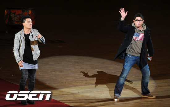 슈퍼주니어 강인과 가수 아웃사이더가 축하무대를 펼치고 있다.