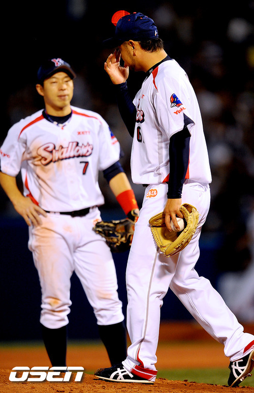 25일 오후 일본 도쿄 진구구장서 열린 센트럴리그 야쿠르트 스왈로스와 히로시마 토요카프의 경기 7회초 야쿠르트 이시이가 히로시마 마시모토를 삼진아웃한 후 마운드를 내주며 눈물을 보이고 있다.