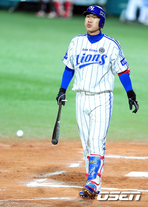 '2011 롯데카드 프로야구 한국시리즈'삼성 라이온즈와 SK 와이번스 경기 1차전 6회말 강봉규가 이재영의 투구에 맞고 한숨을 쉬고 있다. 강봉규는 4회말에도 사구를 맞았다.