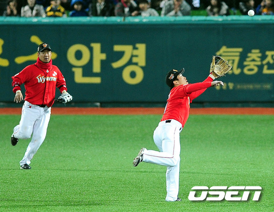 '2011 롯데카드 프로야구 한국시리즈'삼성 라이온즈와 SK 와이번스 경기 1차전 6회말 2사 만루 진갑용의 잘맞은 타구를 SK 정근우가 멋지게 잡고 있다