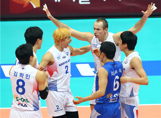 상무신협의 반격은 매서웠다. 서브 리시브가 살아난 상무신협의 무기는 블로킹. 고비마다 블로킹으로 대한항공의 공격을 봉쇄하며 2, 3세트를 잇달아 손에 넣었다.