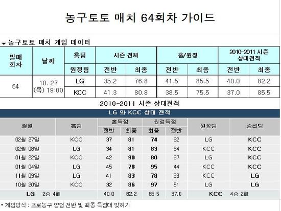 [농구토토] 국민체육진흥공단(www.kspo.or.kr)이 발행하는 체육진흥투표권 수탁사업자인 스포츠토토 공식 온라인 발매사이트인 베트맨(www.betman.co.kr)이 27일 오후 7시 창원실내체육관에서 벌어지는 LG-KCC전 대상 농구토토 매치 64회차 투표율을 중간 집계한 결과, 전체 참가자의 42.70%가 원정팀 KCC의 승리를 점치는 것으로 나타났다.