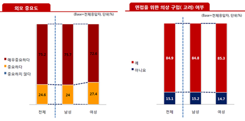 이번 조사에 따르면 대부분의 취업 준비생들은 합격 여부에 ‘외모’가 매우 중요하다고 판단(전체 응답자의 75.2%)하고 있으며, 그 중 80% 이상이 면접을 위한 의상 구입을 고려하고 있다.