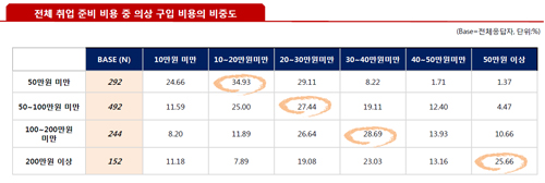 ▲ 취업 준비를 위한 비용 중 의상 구입비 비중은 평균 30%선으로 나타나