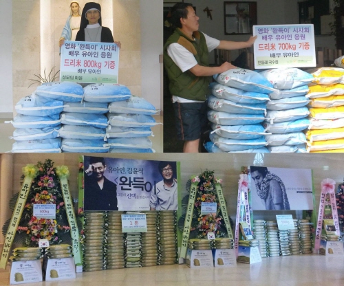 유아인이 기부한 사랑의 쌀은 지난 9월 30일 서울 경희대학교 평화의전당에서 열린 영화 ‘완득이’ 시사회 및 팬미팅에 유아인의 국내외 팬들이 보내온 응원 드리미 쌀화환이다.