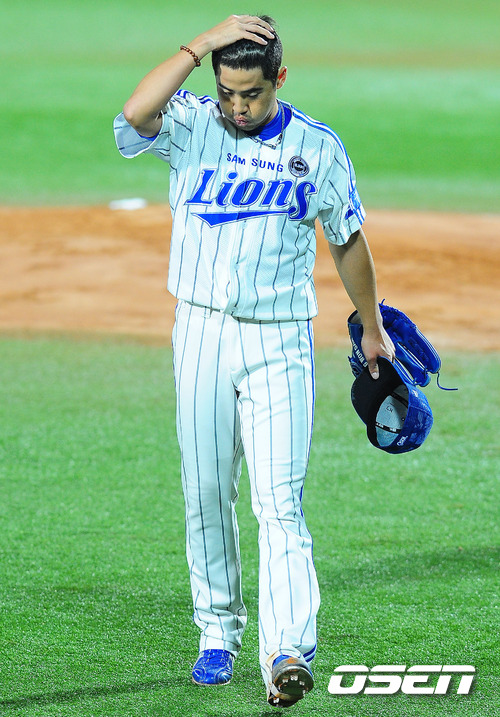 26일 오후 대구구장에서 열린 2011 롯데카드 프로야구 한국시리즈 2차전 삼성 라이온즈와 SK 와이번스 경기, 1회초 2사 1,2루에서 삼성 장원삼이 SK 안치용을 삼진으로 잡고 더그아웃으로 향하고 있다.