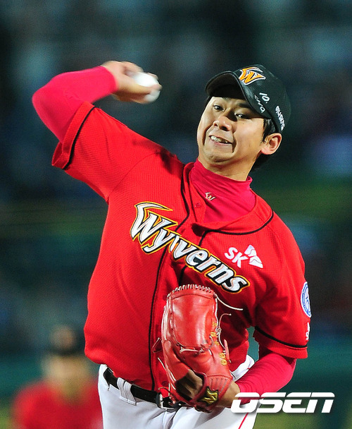 '2011 롯데카드 프로야구 한국시리즈' 2차전 삼성 라이온즈와 SK 와이번스 1회말 SK 윤희상이 힘차게 공을 던지고 있다.