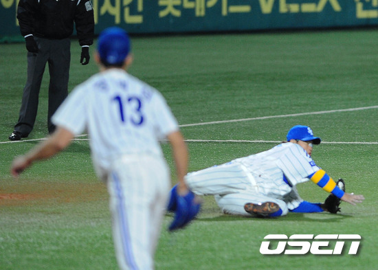 2회초 선두타자 김강민의 3루 강습 안타성 타구를 삼성 박석민 3루수가 포구하며 아웃처리 시키고 있다.