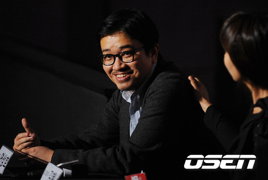 연상호 감독이 배우 김혜나의 칭찬에 환하게 웃고 있다.