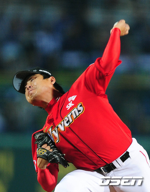 '2011 롯데카드 프로야구 한국시리즈' 2차전 삼성 라이온즈와 SK 와이번스 3회밀 SK 이승호가 힘차게 공을 던지고 있다.