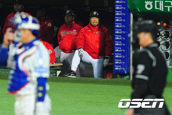26일 오후 대구구장에서 열린 2011 롯데카드 프로야구 한국시리즈 2차전 삼성 라이온즈와 SK 와이번스 경기, 4회초 무사에서 SK 박정권이 삼진을 당하자 이만수 감독대행이 더그아웃에서 김병주 주심을 바라보고 있다.