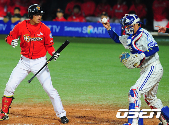 26일 오후 대구구장에서 열린 2011 롯데카드 프로야구 한국시리즈 2차전 삼성 라이온즈와 SK 와이번스 경기, 4회초 무사에서 SK 박정권이 삼진을 당하고 아쉬워하고 있다.