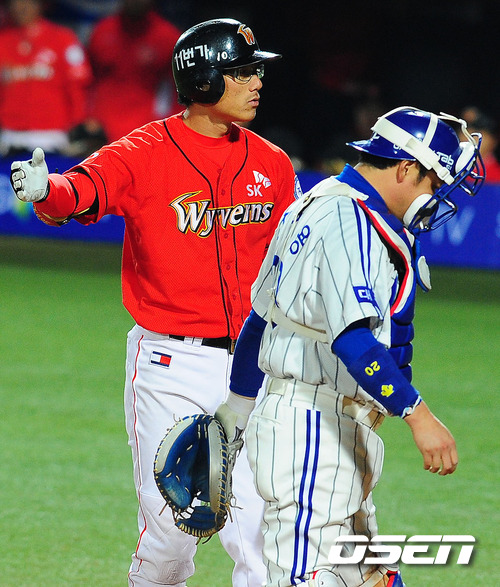 26일 오후 대구구장에서 열린 2011 롯데카드 프로야구 한국시리즈 2차전 삼성 라이온즈와 SK 와이번스 경기, 4회초 무사에서 SK 박정권이 삼진을 당하고 아쉬워하고 있다.