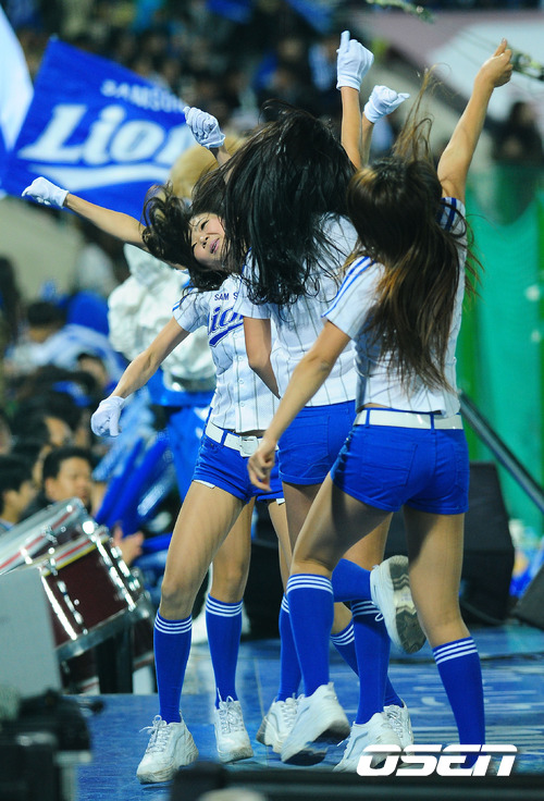 26일 오후 대구구장에서 열린 2011 롯데카드 프로야구 한국시리즈 2차전 삼성 라이온즈와 SK 와이번스 경기, 삼성 치어리더가 열띤 응원을 선보이고 있다.