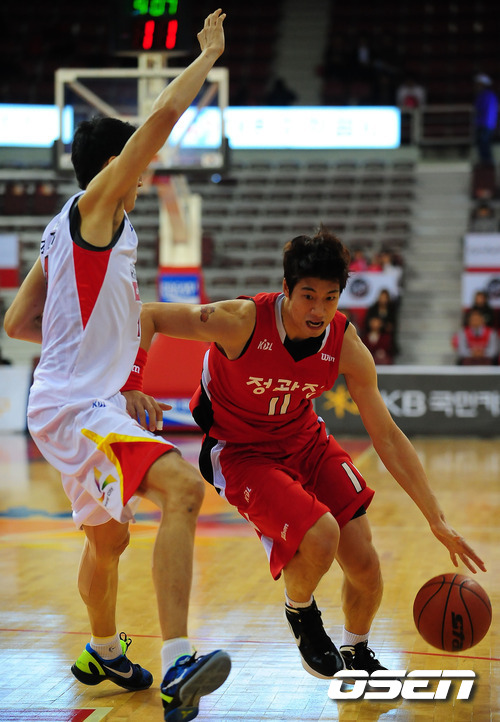 26일 오후 안양실내체육관에서 열린 '2011~2012 KB국민카드 프로농구' 안양 KGC와 고양 오리온스 경기에서 1쿼터 KGC의 양희종이 오리온스 최진수를 돌파하고 있다.
