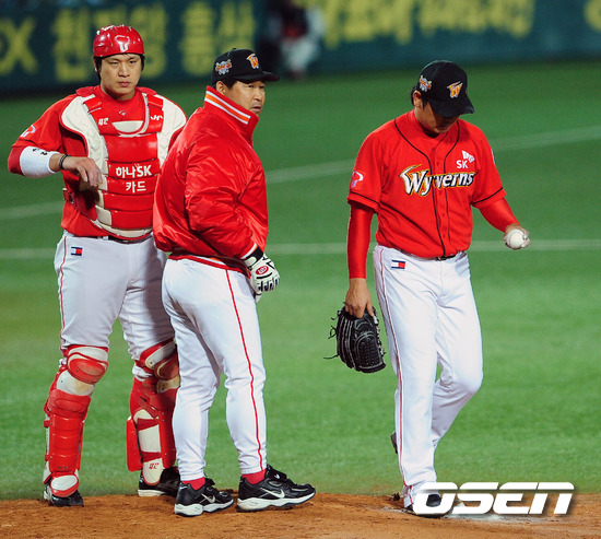 4회말 1사 1,2루 이만수 감독대행이 이승호를 마운드에서 내려보내고 고든으로 투수 교체를 하고 있다.