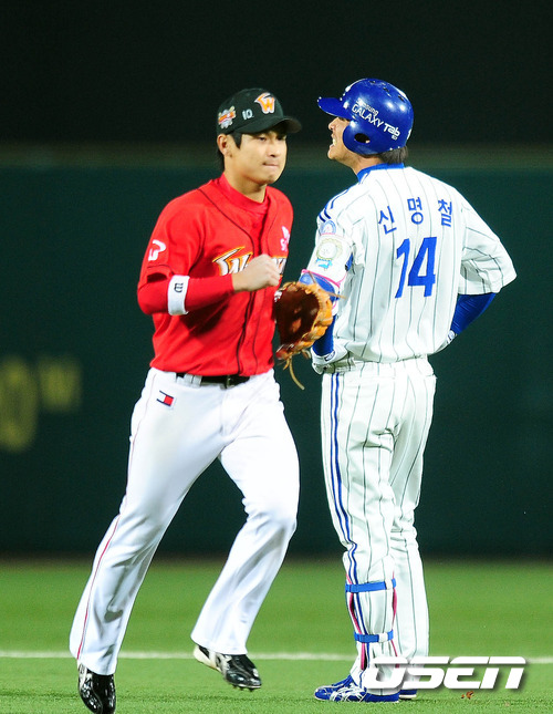 '2011 롯데카드 프로야구 한국시리즈' 2차전 삼성 라이온즈와 SK 와이번스 4회말 2사 1,2루 신명철의 잘맞은 타구가 펜스 근처에서 잡히자 아쉬워 하고 있다.