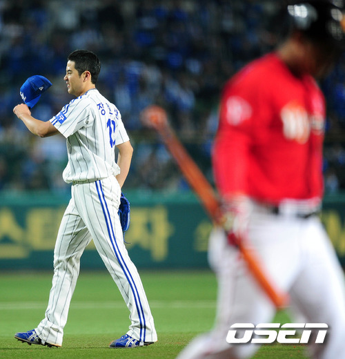 '2011 롯데카드 프로야구 한국시리즈' 2차전 삼성 라이온즈와 SK 와이번스 5회초 장원삼이 세타자를 모두 삼진으로 처리하고 주먹을 불끈 쥐고 있다.