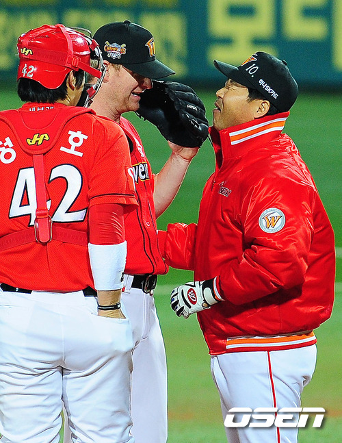 26일 오후 대구구장에서 열린 2011 롯데카드 프로야구 한국시리즈 2차전 삼성 라이온즈와 SK 와이번스 경기, 5회말 2사 1루에서 SK 이만수 감독대행이 고든을 교체하며 이야기를 나누고 있다.