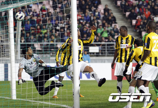 [OSEN=전주월드컵경기장 ,백승철 인턴기자] 26일 오후 전주월드컵경기장에서 열린 '2011 아시아축구연맹(AFC) 챔피언스리그' 4강 2차전 전북 현대와 알 이티하드(사우디아라비아)의 경기 전반 에닝요의 코너킥이 골문으로 빨려 들어가면서 전북이 2-0으로 앞섰다.