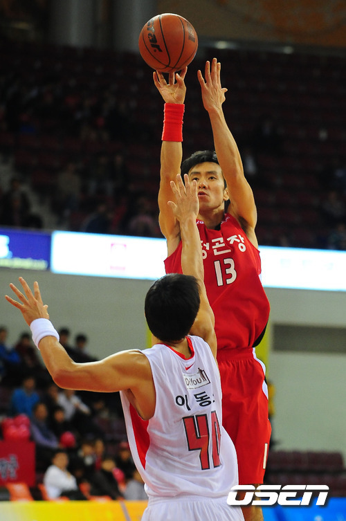 26일 오후 안양실내체육관에서 열린 '2011~2012 KB국민카드 프로농구' 안양 KGC와 고양 오리온스 경기에서 2쿼터 KGC의 김성철이 오리온스 이동준의 블로킹을 피해 외곽 점프슛을 날리고 있다.
