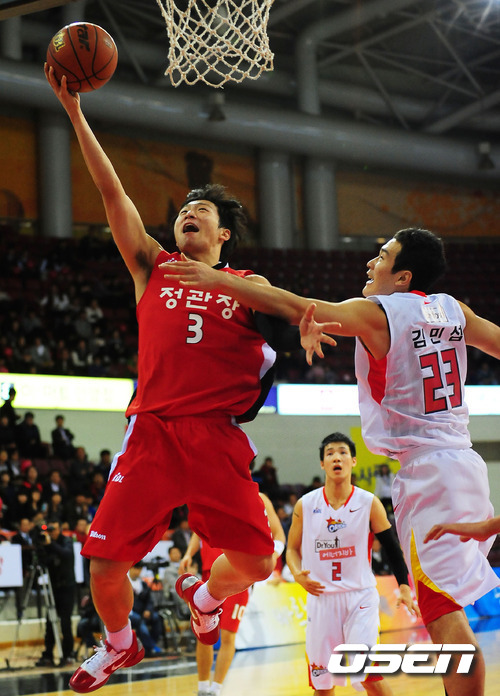 26일 오후 안양실내체육관에서 열린 '2011~2012 KB국민카드 프로농구' 안양 KGC와 고양 오리온스 경기에서 2쿼터 KGC의 이정현이 오리온스 김민섭의 블로킹을 피해 레이업슛을 날리고 있다.