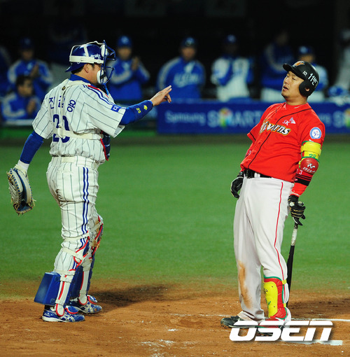 6회초 1사 2,3루 안치용 삼진아웃 처리되며 아쉬워하고 있다.