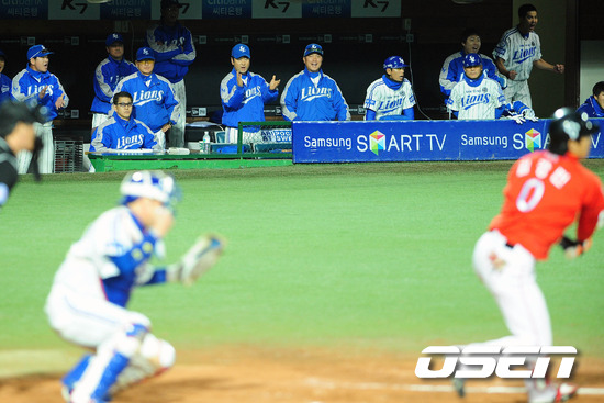 6회초 2사 2,3루 위기상황에서 김강민을 삼진아웃 처리시키자며 수비를 마치자 삼성 덕아웃이 환호하고 있다.