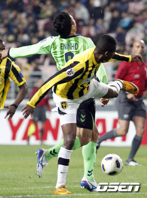 [OSEN=전주월드컵경기장 ,백승철 인턴기자] 26일 오후 전주월드컵경기장에서 열린 '2011 아시아축구연맹(AFC) 챔피언스리그' 4강 2차전 전북 현대와 알 이티하드(사우디아라비아)의 경기 후반 전북 에닝요가 알 이티하드 수비수와의 몸싸움에서 프리킥을 얻어내고 있다.