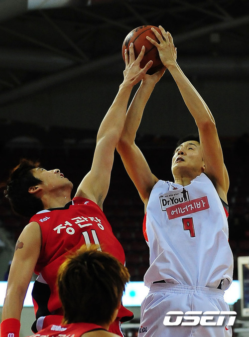 26일 오후 안양실내체육관에서 열린 '2011~2012 KB국민카드 프로농구' 안양 KGC와 고양 오리온스 경기에서 3쿼터 오리온스 조상현이 점프슛을 날릴때 KGC 양희종이 블로킹하고 있다.