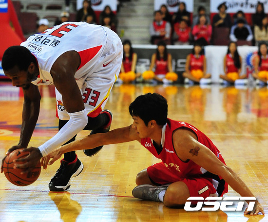 26일 오후 안양실내체육관에서 열린 '2011~2012 KB국민카드 프로농구' 안양 KGC와 고양 오리온스 경기에서 3쿼터 오리온스 윌리엄스가 돌파를 시도할때 넘어진 KGC 김태술이 볼을 뺏으려 하고 있다.