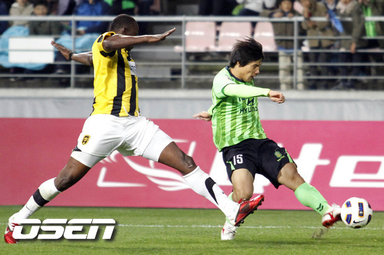 [OSEN=전주월드컵경기장 ,백승철 인턴기자] 26일 오후 전주월드컵경기장에서 열린 '2011 아시아축구연맹(AFC) 챔피언스리그' 4강 2차전 전북 현대와 알 이티하드(사우디아라비아)의 경기 후반 전북 김동찬이 슛을 날리고 있다.