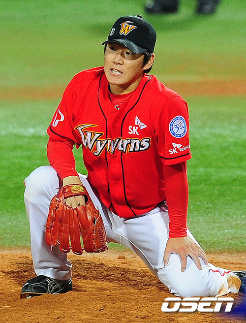 26일 오후 대구구장에서 열린 2011 롯데카드 프로야구 한국시리즈 2차전 삼성 라이온즈와 SK 와이번스 경기, 6회말 2사 만루에서 삼성 배영섭에 선취 2타점 적시타를 허용한 SK 박희수가 아쉬워하고 있다.
