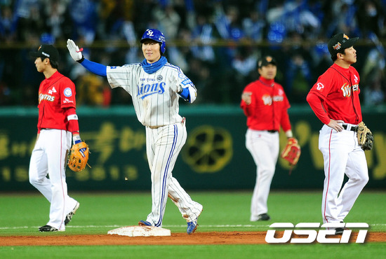 '2011 롯데카드 프로야구 한국시리즈' 2차전 삼성 라이온즈와 SK 와이번스 6회말 2사 만루 배영섭이 2타점 적시타를 치고 실책을 틈 타 2루까지 뛴 후 환호하고 있다.