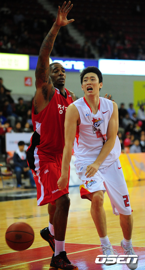 26일 오후 안양실내체육관에서 열린 '2011~2012 KB국민카드 프로농구' 안양 KGC와 고양 오리온스 경기에서 3쿼터 오리온스 김강선이 KGC 화이트의 블로킹을 피해 골대 밑에서 패스로 연결하고 있다.