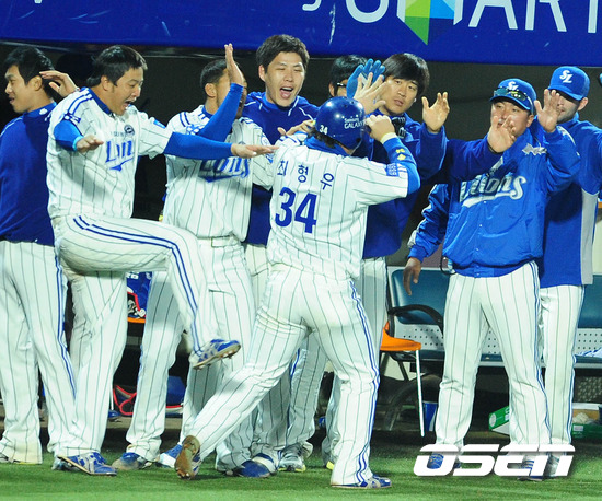 6회말 2사 만루 배영섭 선취 2타점 적시타때 최형우가 득점을 올리며 덕아웃 동료들의 환영을 받고 있다.