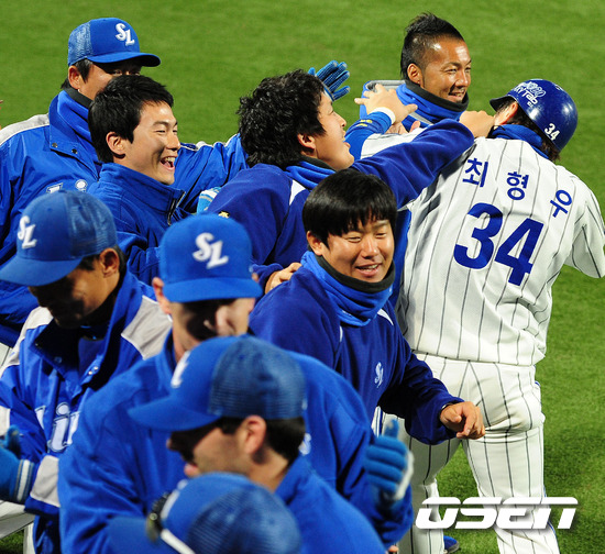 26일 오후 대구구장에서 열린 2011 롯데카드 프로야구 한국시리즈 2차전 삼성 라이온즈와 SK 와이번스 경기, 6회말 2사 만루에서 삼성 배영섭의 선취 2타점 적시타에 홈을 밟은 최형우가 더그아웃에서 동료선수들의 축하를 받고 있다.
