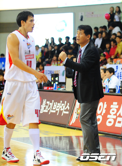 26일 오후 안양실내체육관에서 열린 '2011~2012 KB국민카드 프로농구' 안양 KGC와 고양 오리온스 경기에서 4쿼터 오리온스 추일승 감독이 이동준을 불러 지시를 내리고 있다.