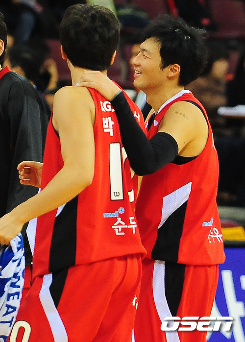 경기를 마치고 KGC 이정현이 박찬희와 기쁨을 나누고 있다.