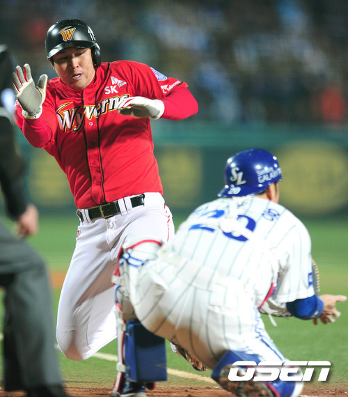 '2011 롯데카드 프로야구 한국시리즈' 2차전 삼성 라이온즈와 SK 와이번스 8회초 2사 1,2루 최동수의 중전 안타때 최정이 홈을 노렸지만 아웃되고 있다.