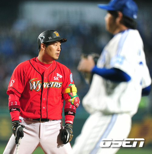 '2011 롯데카드 프로야구 한국시리즈' 2차전 삼성 라이온즈와 SK 와이번스 8회초 무사 1,2루 SK 안치용이 희생번트를 실패하고 아쉬워 하고 있다.